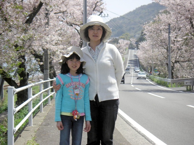 長女は近所で花見(オヤジっぽいな)、残った3人は隣町の図書館へ向かう途中、桜が綺麗な場所で記念撮影。